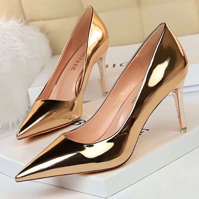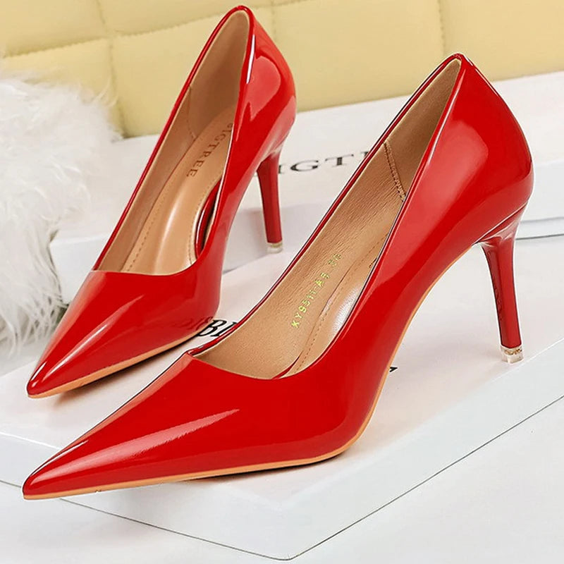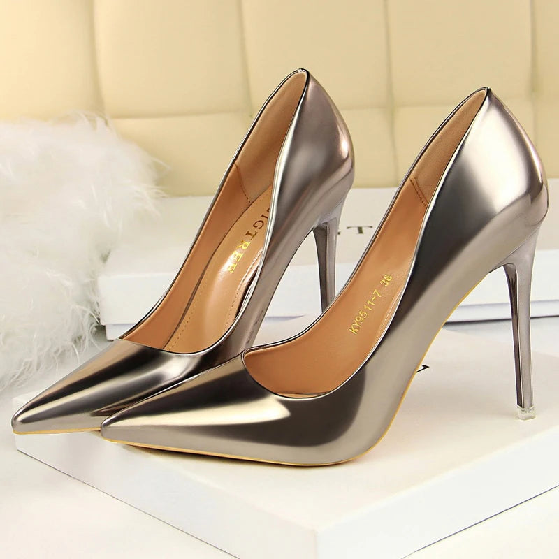 Mit diesen klassischen Lackleder-Pumps setzt du ein stilvolles Statement – ganz gleich, ob im Office, beim Date oder als eleganter Akzent zum Kleid. Die klare Linienführung, die glänzende Oberfläche und der schmale Stilettoabsatz bringen feminine Eleganz auf den Punkt.