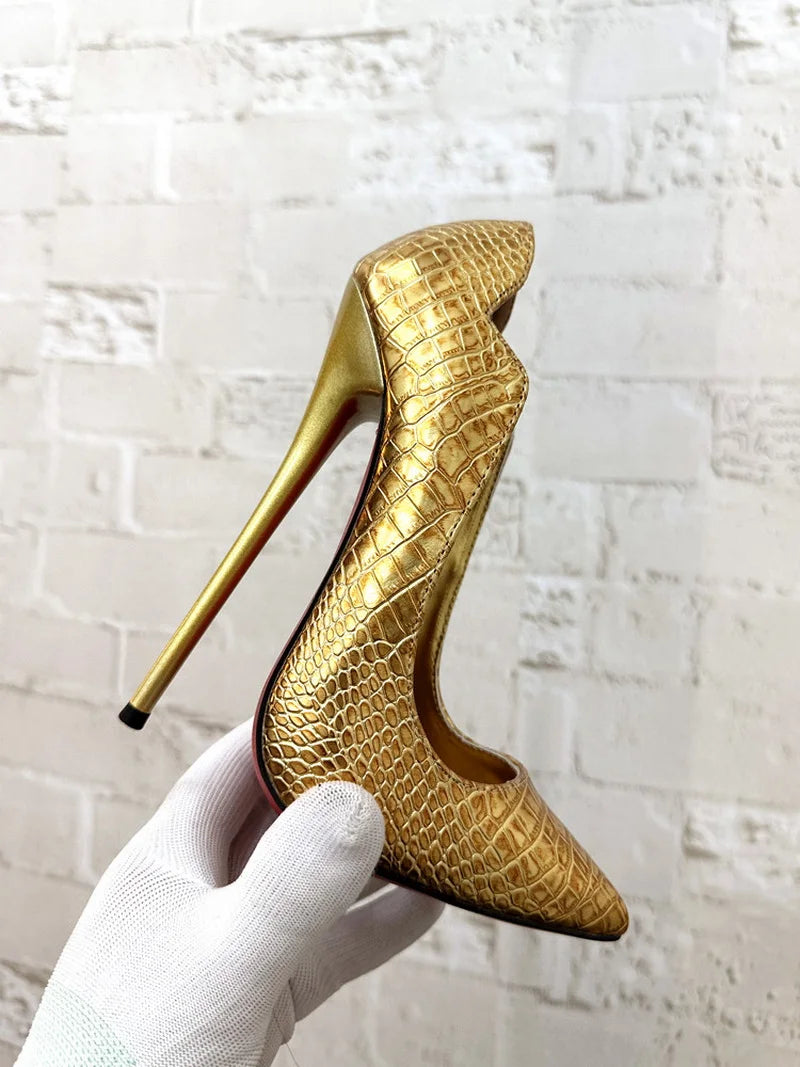 Diese extravaganten High Heels mit Croco-Struktur setzen ein klares Fashion-Statement: kraftvoll, feminin und absolut stilbewusst. Mit einem markanten Absatz von ca. 16 cm und einem eleganten, spitz zulaufenden Design sind sie wie geschaffen für starke Looks – ob beim Event, am Laufsteg oder als Eyecatcher zum klassischen Outfit.