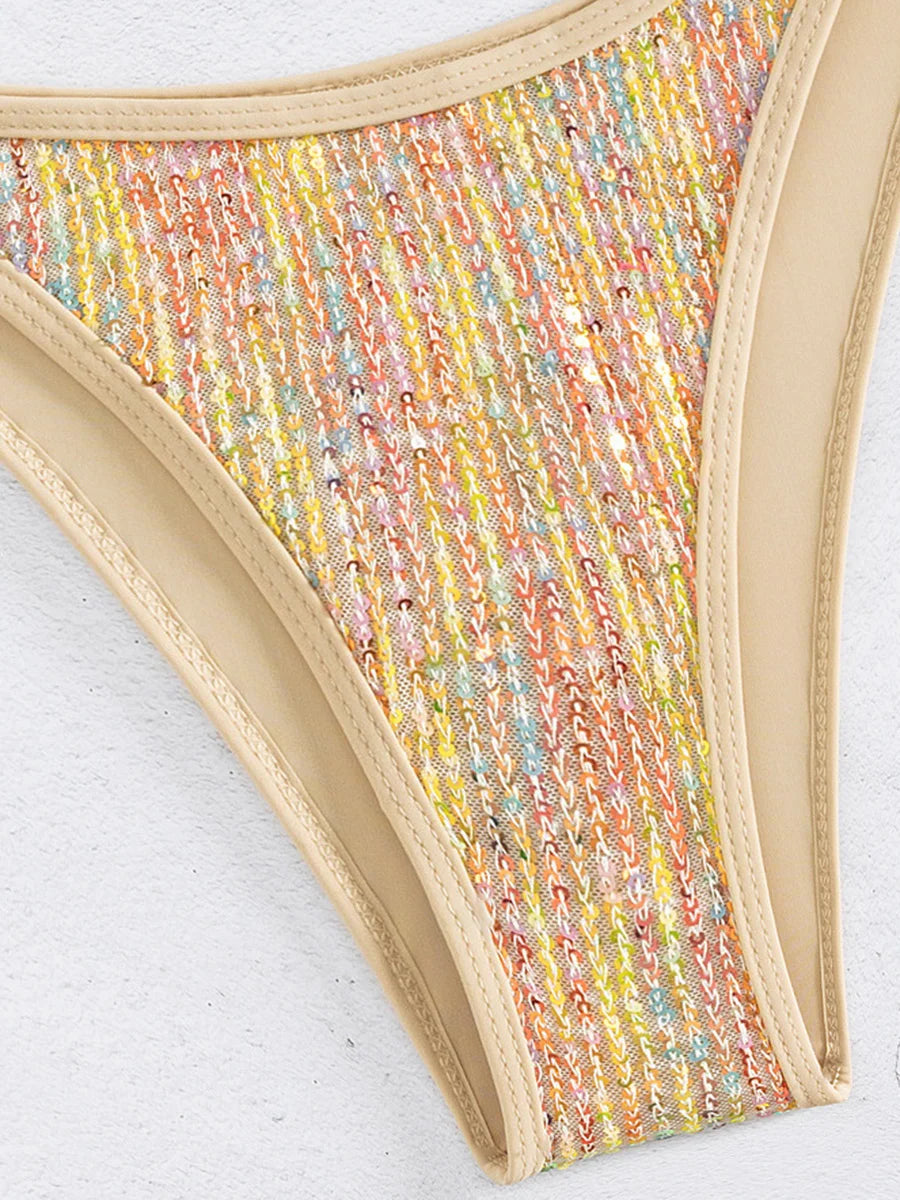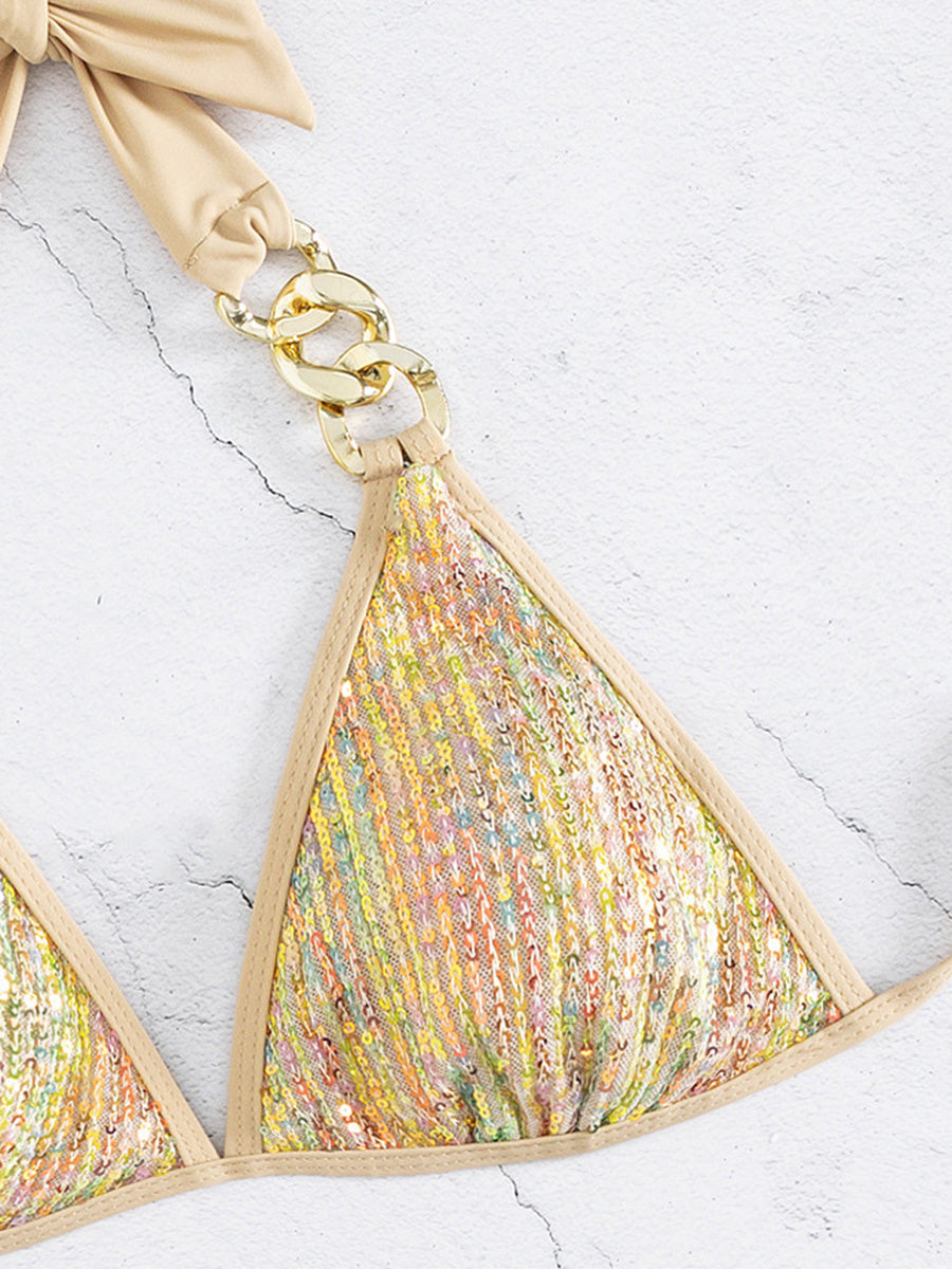 Dieses zweiteilige Bikini-Set kombiniert ein glänzendes Triangel-Top mit schimmernden Pailletten und eleganten Metallketten-Trägern. Der figurbetonte Schnitt bringt deine Kurven perfekt zur Geltung – ideal für den Strand, den Pool oder besondere Sommermomente.
