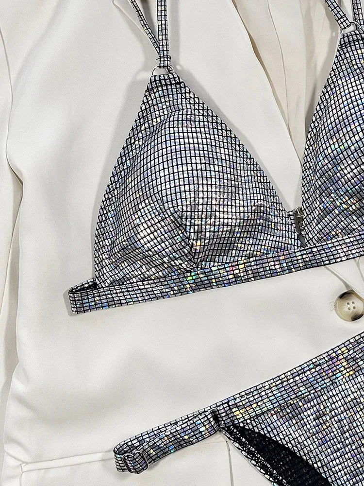 Dieses zweiteilige Bikini-Set verzaubert mit glänzenden goldenen Pailletten, einem sexy Haltertop und einem hohen Beinausschnitt, der deine Figur wunderschön in Szene setzt. Ideal für Poolpartys, Beachclubs oder Urlaubsreisen.