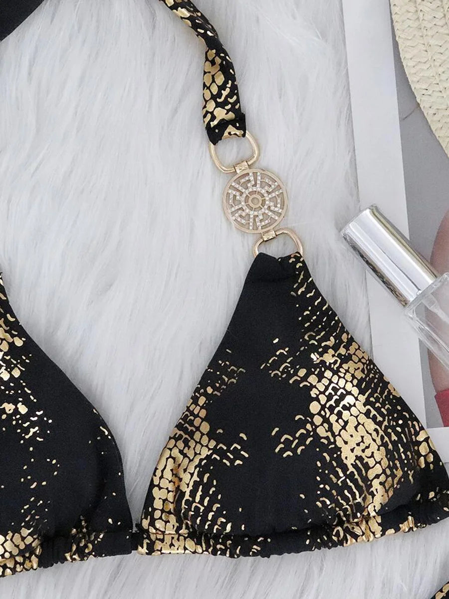 Dieses zweiteilige Bikini-Set kombiniert angesagten Schlangenmuster-Style mit funkelnden Diamantdetails, verstellbarem Haltertop und einem figurbetonten High-Cut-Slip. Ideal für heiße Strandtage, Poolpartys oder stylische Beachclubs.