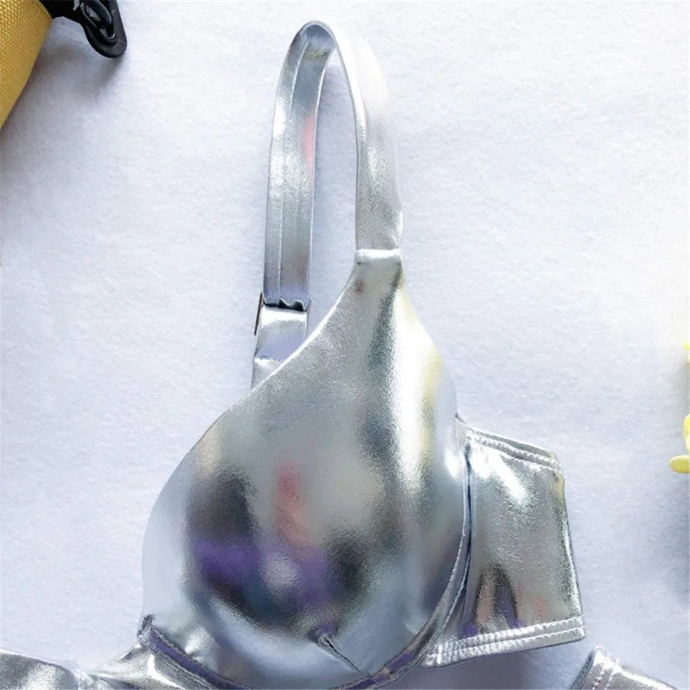 Dieses zweiteilige Bikini-Set kombiniert ein BH-Top mit Cups und eine knappe Bikinihose in angesagter goldener Lederoptik. Perfekt für mutige Styles am Strand, Pool oder auf Partys.